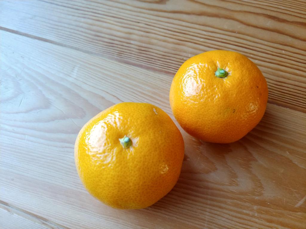 | 田口早生の見た目 外皮が張っていて薄い。みずみずしい印象。 | 向山中生の見た目 外皮がボコボコしている。色も味も濃い。 |